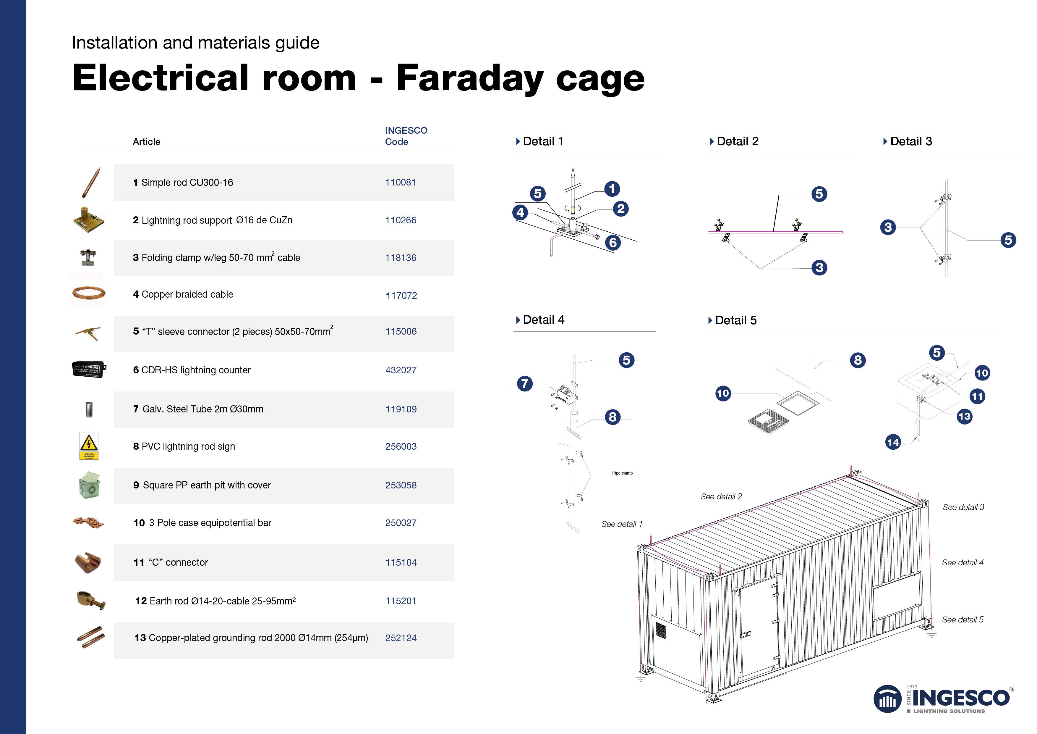 • Air terminals, conductors, and down conductors: copper, aluminum, and stainless steel.