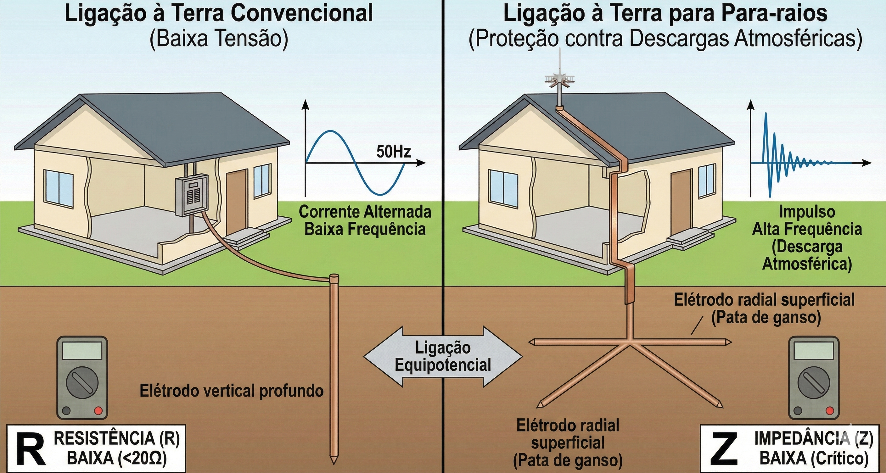 Exemplo típico: Um único elétrodo vertical de 3 metros pode medir 5 ohmios (valor baixo de resistência), mas o seu comportamento face a um impulso de alta frequência pode ser ineficaz, obrigando a corrente a procurar caminhos alternativos perigosos.